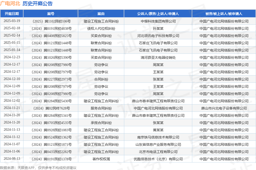 本站消息,根据天眼查APP显示,近日公布了一则中国广电河北网络股份有限公司作为被告/被上诉人的开庭公告,详细内容如下:
